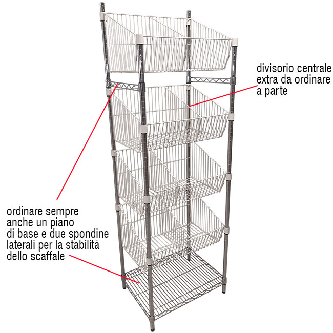 Attenzione: Per la stabilità dello scaffale con le ceste a bocca di lupo ordinare anche un piano standard L.60 x P.45 cm (cod. joyrip45x060) da posizionare in basso e due Sponda laterale bassa P.45 cm (cod.joyspondL045) come da immagine