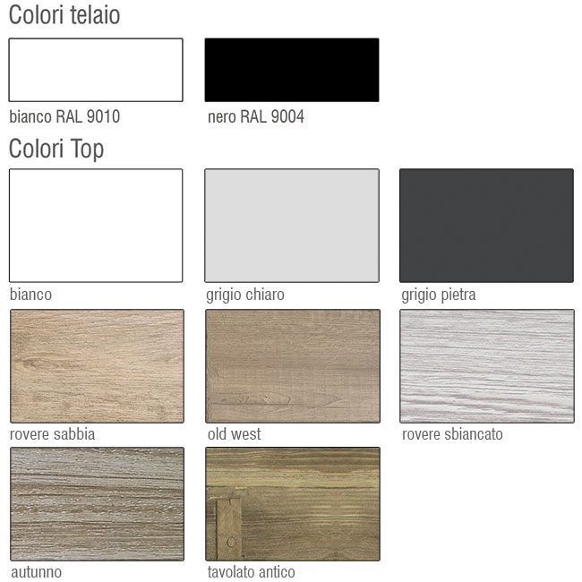 Finitura Top : Bianco / Grigio chiaro / Grigio pietra / Autunno / Tavolato antico / Rovere sbiancato / Old West / Rovere sabbia