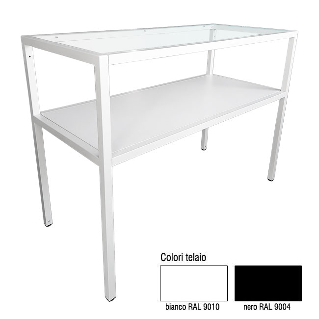 Tavolo di servizio per negozi a due piani, uno in legno e uno in vetro temperato